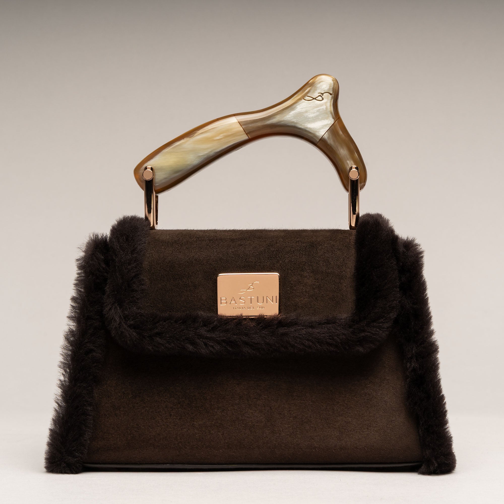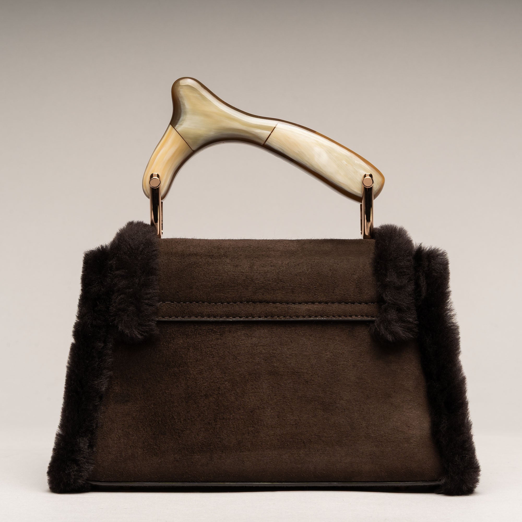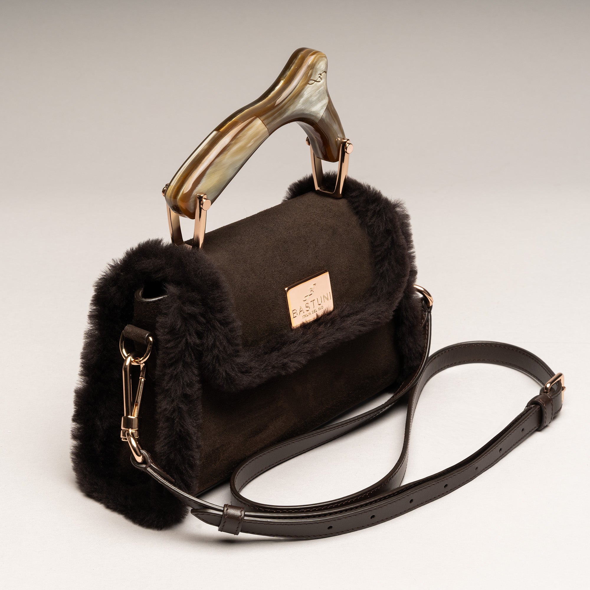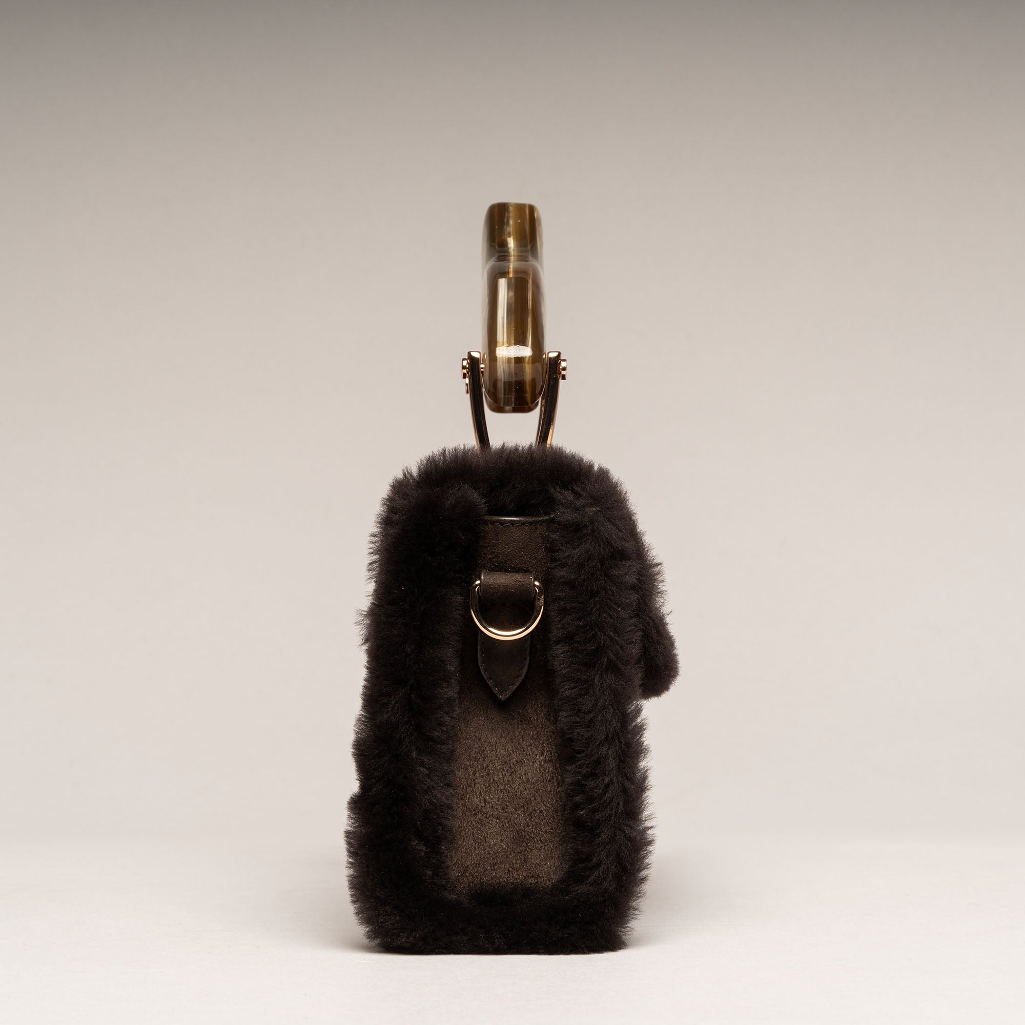 CHIONE è neve che si fa carezza. Montone soffice, corno naturale scolpito a mano, finiture in oro chiaro rosato: una creatura di inverno che scalda l’anima. Ogni borsa è unica