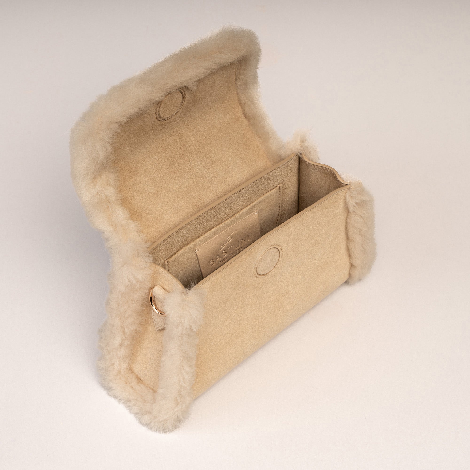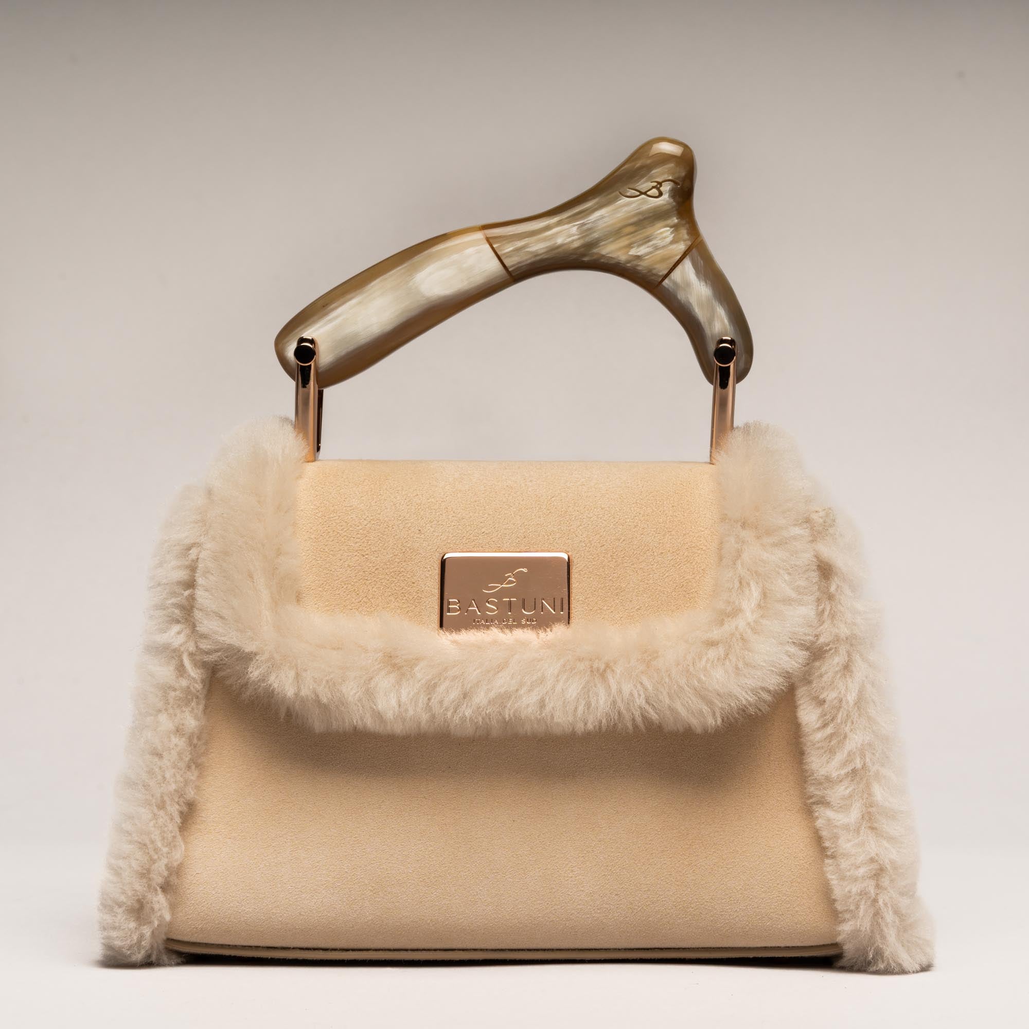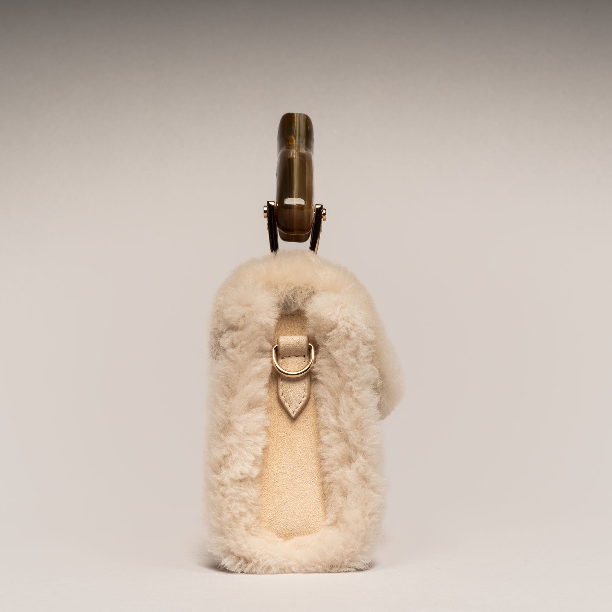 CHIONE é neve que se transforma em carinho. Shearling macio, chifre natural esculpido à mão, acabamentos em ouro rosa claro: uma criatura de inverno que aquece a alma. Cada bolsa é única